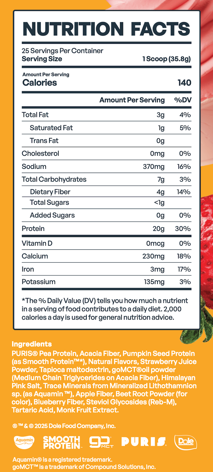 PURIS® Pea Protein, Acacia Fiber, Pineapple Juice Powder, Natural Flavors, Pumpkin Seed Protein (as Smooth Protein™), Tapioca Maltodextrin, Medium Chain Triglycerides (Medium Chain Triglycerides on Acacia Fiber)(as goMCT®), Himalayan Pink Salt, Trace minerals from Mineralized Red Algae (Lithothamnion sp. (as Aquamin™), Apple Fiber, Turmeric Extract (Color), Blueberry Fiber, Tartaric Acid, Reb-M, Monk Fruit Extract.