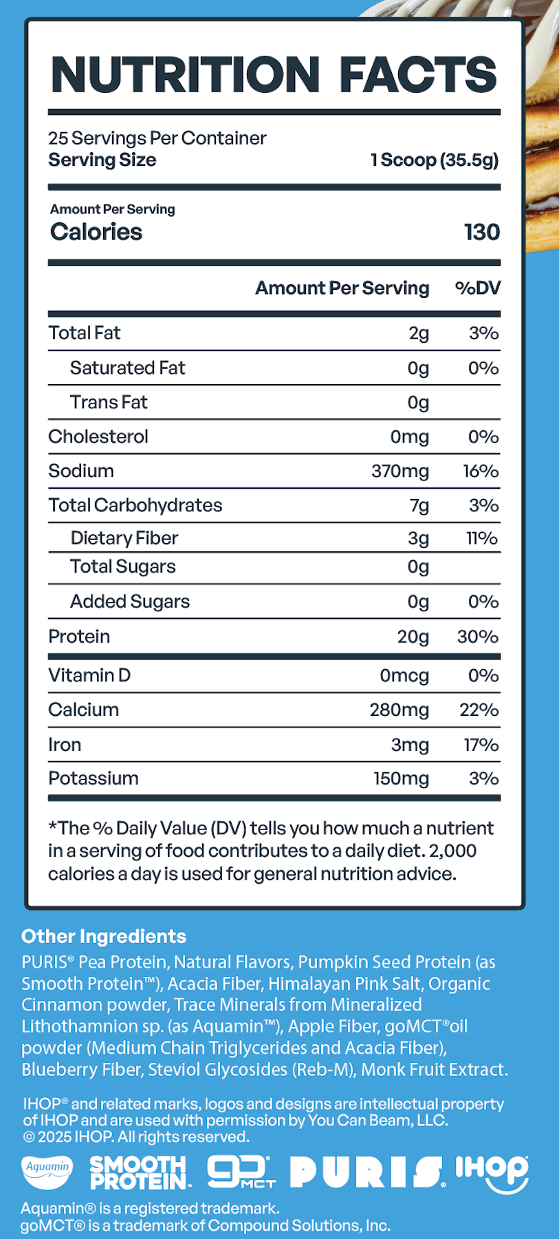 PURIS® Pea Protein, Natural Flavors, Pumpkin Seed Protein (as Smooth Protein™), Organic Blueberry Powder, Acacia Fiber, Cocoa Butter Powder (as goCOCOAT™) (Cocoa Butter, Coconut Oil, Tapioca Starch and Fiber), Himalayan Pink Salt, Trace Minerals from Mineralized Lithothamnion sp. (as Aquamin ™), Apple Fiber, Blueberry Fiber, Steviol Glycosides (Reb-M), Monk Fruit Extract.
