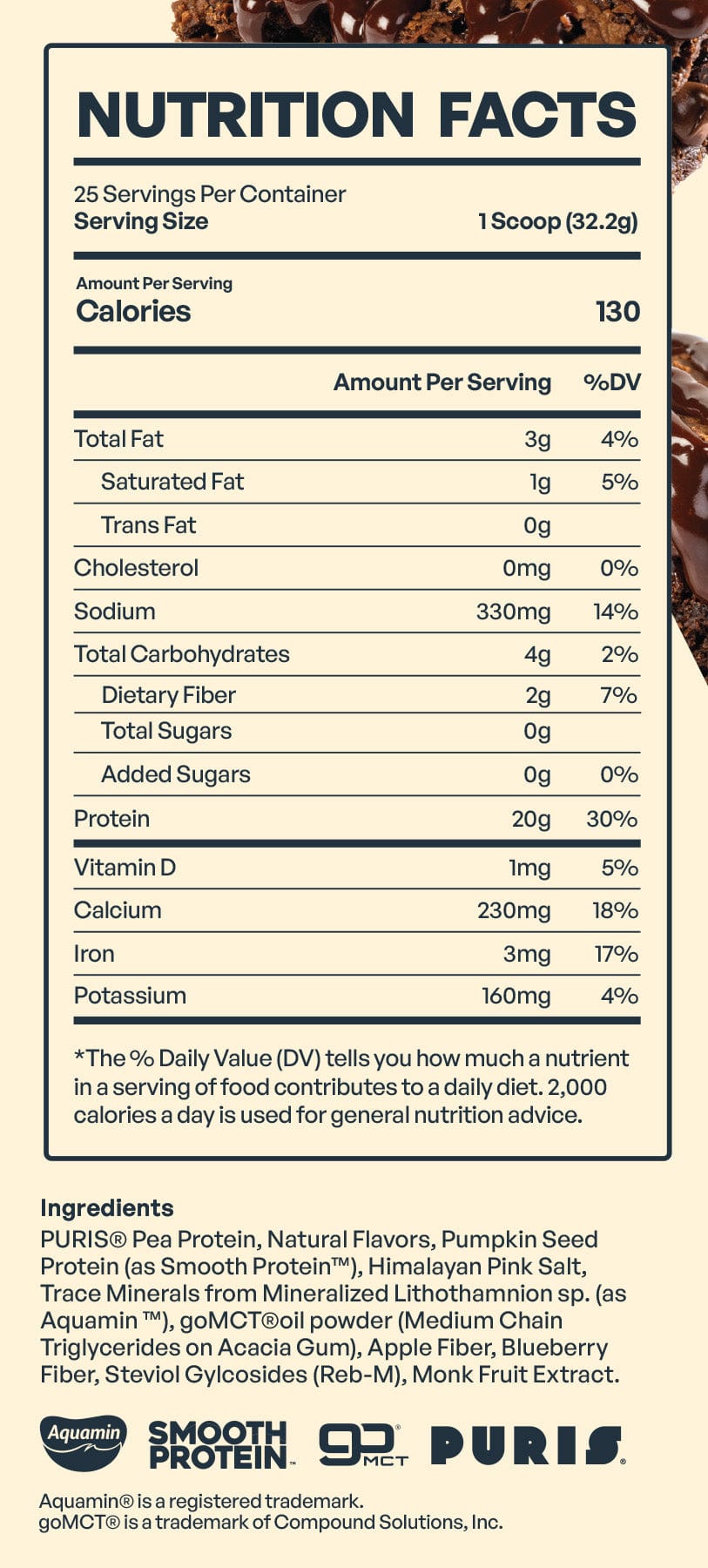 PURIS® Pea Protein, Natural Flavors, Pumpkin Seed Protein (as Smooth Protein™), Acacia Fiber, Himalayan Pink Salt, Trace Minerals from Mineralized Lithothamnion sp. (as Aquamin ™), Apple Fiber, Cocoa Butter Powder (as goCOCOA™) (Cocoa Butter, Coconut Oil, Tapioca Starch and Fiber), Blueberry Fiber, Steviol Glycosides (Reb-M), Monk Fruit Extract.