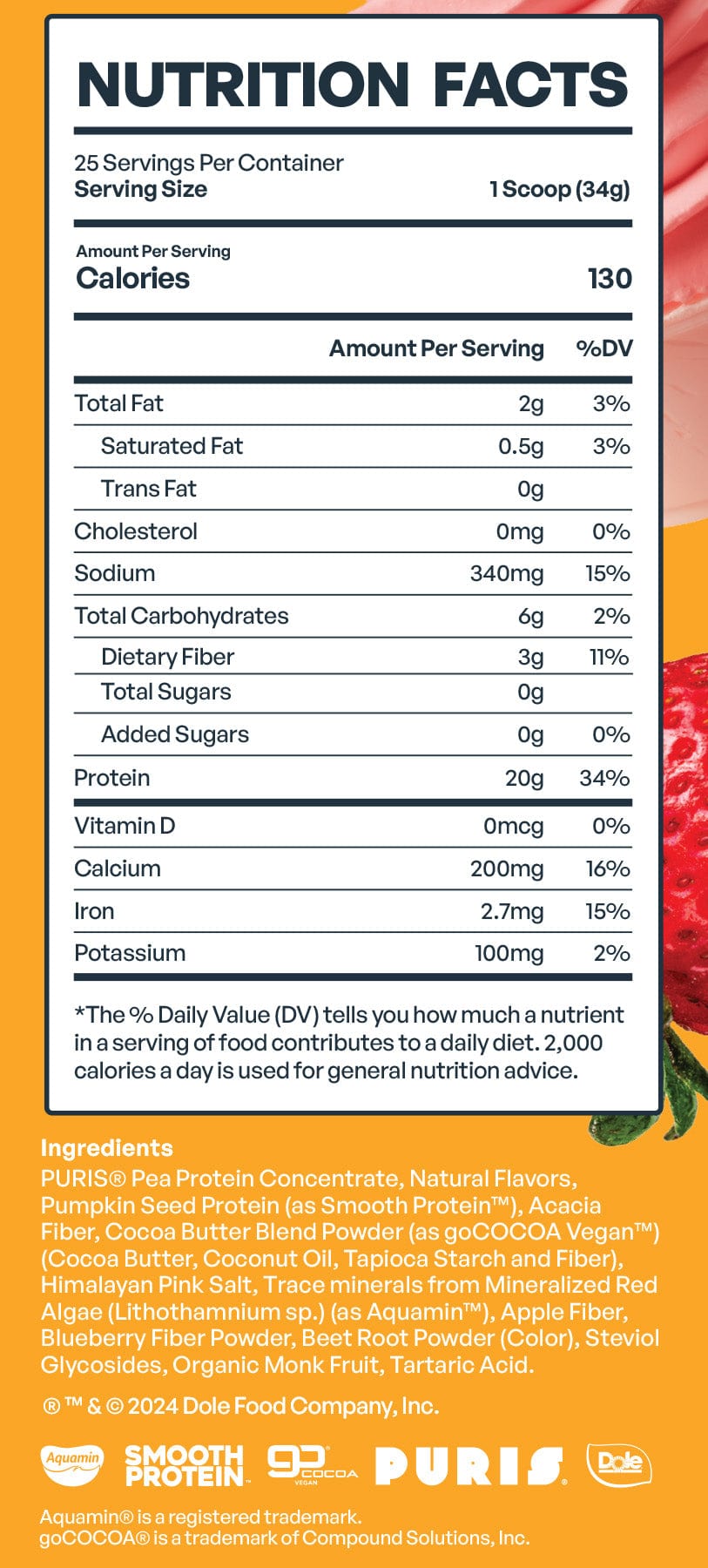PURIS® Pea Protein Concentrate, Natural Flavors, Pumpkin Seed Protein (as Smooth Protein™), Acacia Fiber, Cocoa Butter Blend Powder (as goCOCOA Vegan™) (Cocoa Butter, Coconut Oil, Tapioca Starch and Fiber), Himalayan Pink Salt, Trace minerals from Mineralized Red Algae (Lithothamnium sp.) (as Aquamin™), Apple Fiber, Blueberry Fiber Powder, Beet Root Powder (Color), Steviol Glycosides, Organic Monk Fruit, Tartaric Acid.