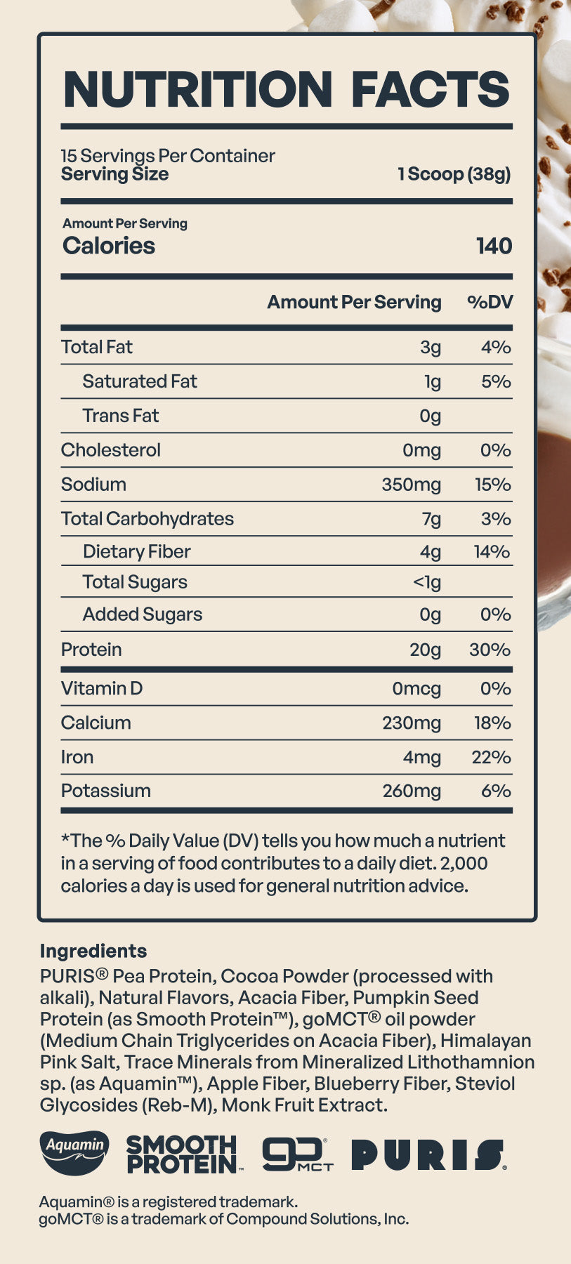 PURIS® Pea Protein, Cocoa Powder (processed with alkali), Natural Flavors, Acacia Fiber, Pumpkin Seed Protein (as Smooth Protein™), goMCT® oil powder (Medium Chain Triglycerides on Acacia Fiber), Himalayan Pink Salt, Trace Minerals from Mineralized Lithothamnion sp. (as Aquamin™), Apple Fiber, Blueberry Fiber, Steviol Glycosides (Reb-M), Monk Fruit Extract.