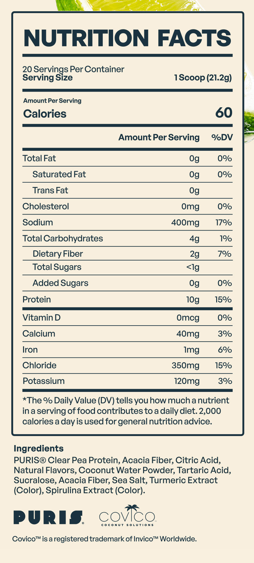 PURIS® Clear Pea Protein, Acacia Fiber, Citric Acid, Natural Flavors, Coconut Water Powder, Tartaric Acid, Sucralose, Sea Salt, Vegetable Juice Color.